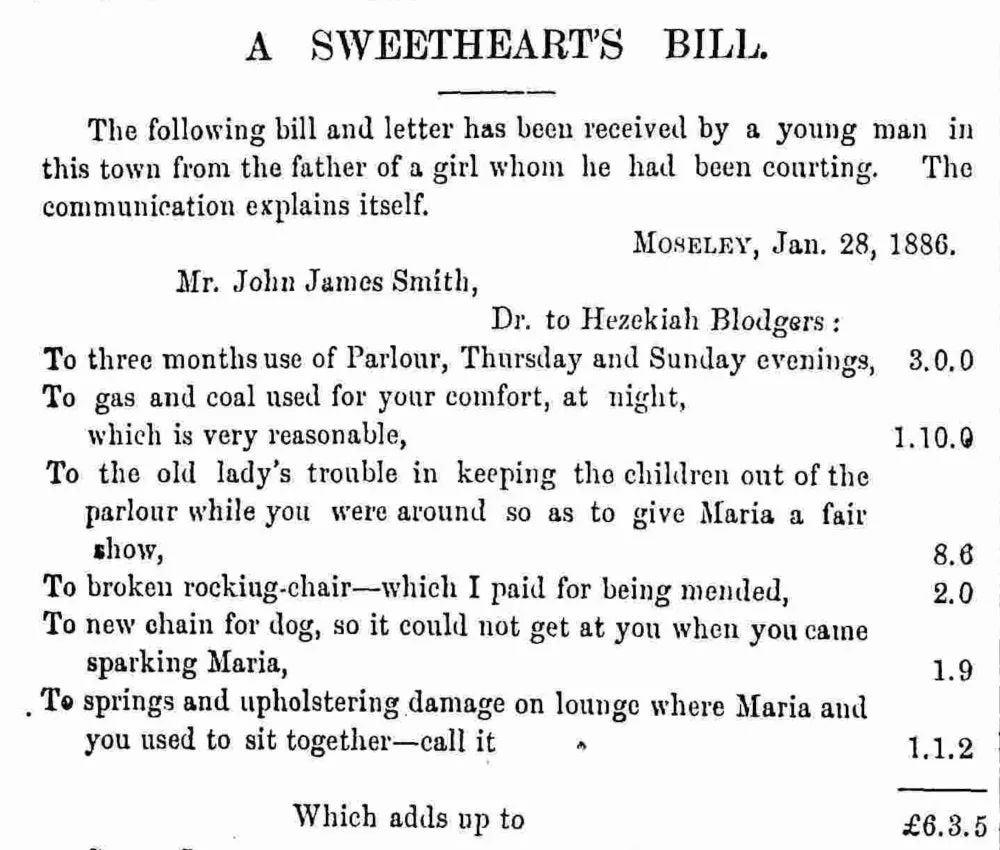 Hezekiah Blodgers, “A Sweetheart’s Bill,” The Owl: A Journal of Wit and Wisdom 15.370 (February 26, 1886): 10.