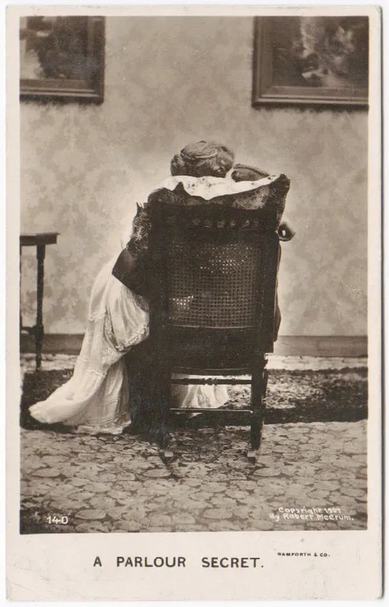 明信片中是一对坐在椅子上的情侣。为英国约克郡西部的Bamforth & Co公司制作,这家拍摄和插图公司以黄色海滨插画而闻名(1907年)。© wikimedia这首诗借鉴了弗里德里希·哈尔姆(Friedrich Halm)的戏剧《野蛮人因戈马》(Ingomar, The Barbarian)中的套路,将精神上的狂喜降为身体上的亲密。我对19世纪的性了解得不够,所以我不敢妄言。偷偷摸摸地坐在腿上?是《爱经》(Kama Sutra,古印度一本关于性爱的经典书籍,译者注)中“爱的摇摆”的衍生形式?又或者,摇椅是一种委婉说法,摇椅的吱吱声为了掩盖那酥软入骨的呻吟?