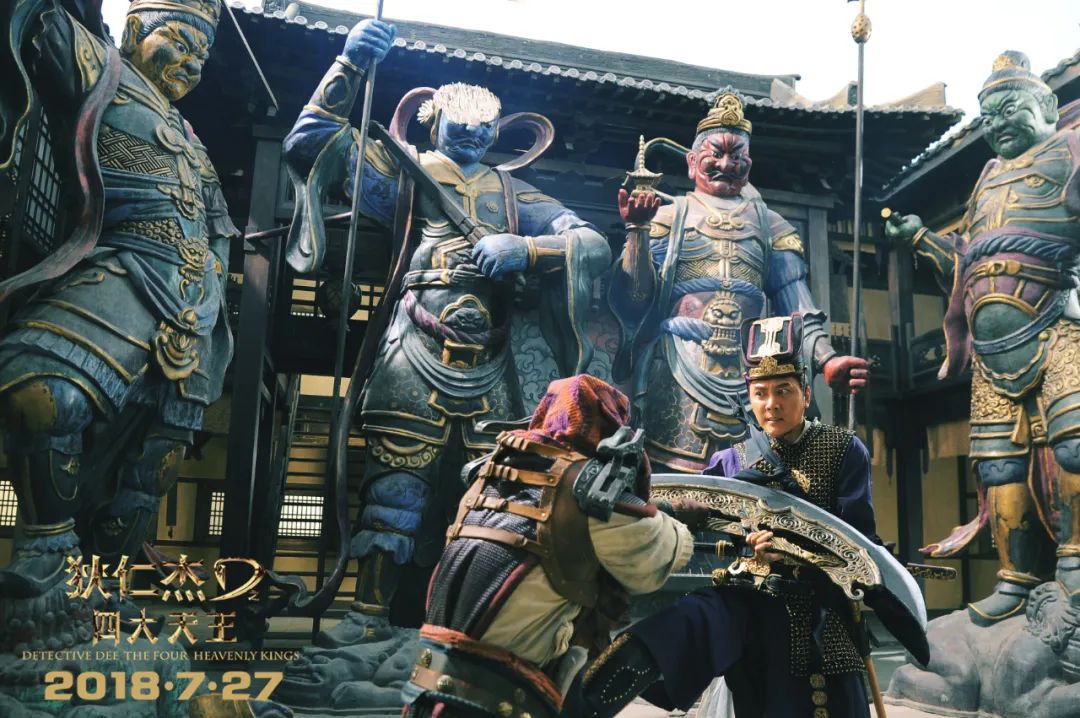 《狄仁杰之通天帝国》里,最超现实的元素不过是有历史原型的“通天佛像”和一种名为“赤焰金龟”的西域毒虫,续集《狄仁杰之神都龙王》上映于2013年,主角们要对抗的成了巨型水怪,到2018年的《狄仁杰之四大天王》,有了“方术”的设定,金龙、触手、怒目天王等等神怪元素密集出现,已经很难再将影片界定为侦探推理类型。