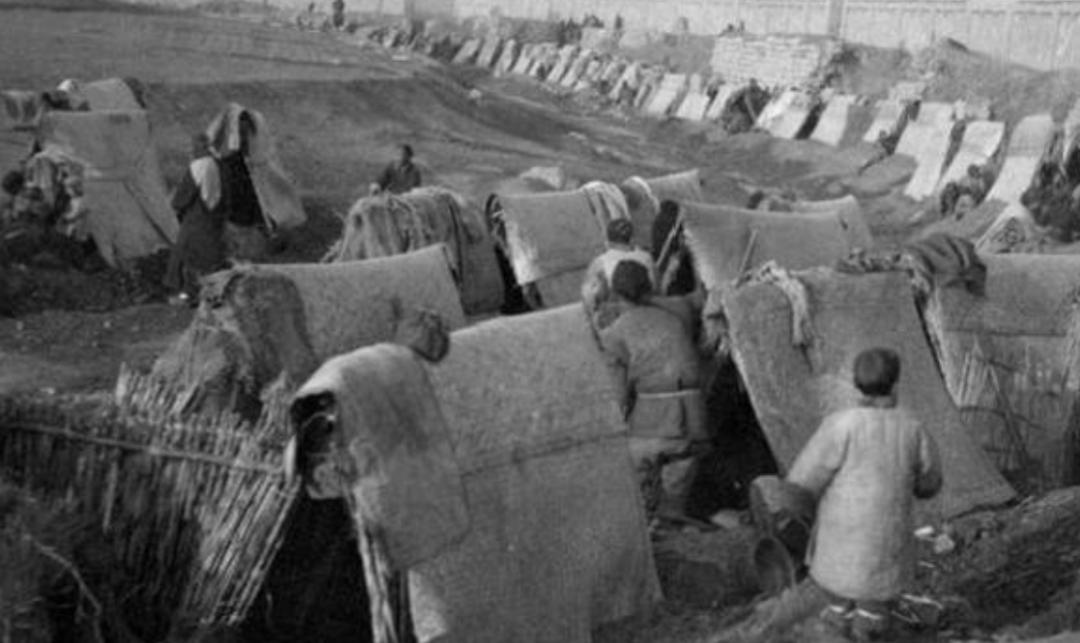 (图片为:闯关东时期难民在路上搭起来的窝棚)