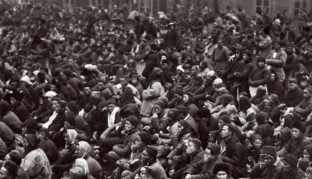 (图片为:难民们席地而坐,等待检疫,进入东北)