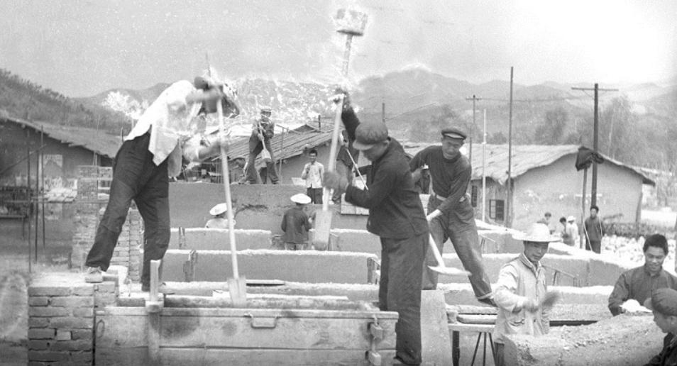 (图片为:十堰红卫厂工人们用干打垒的方法建房)