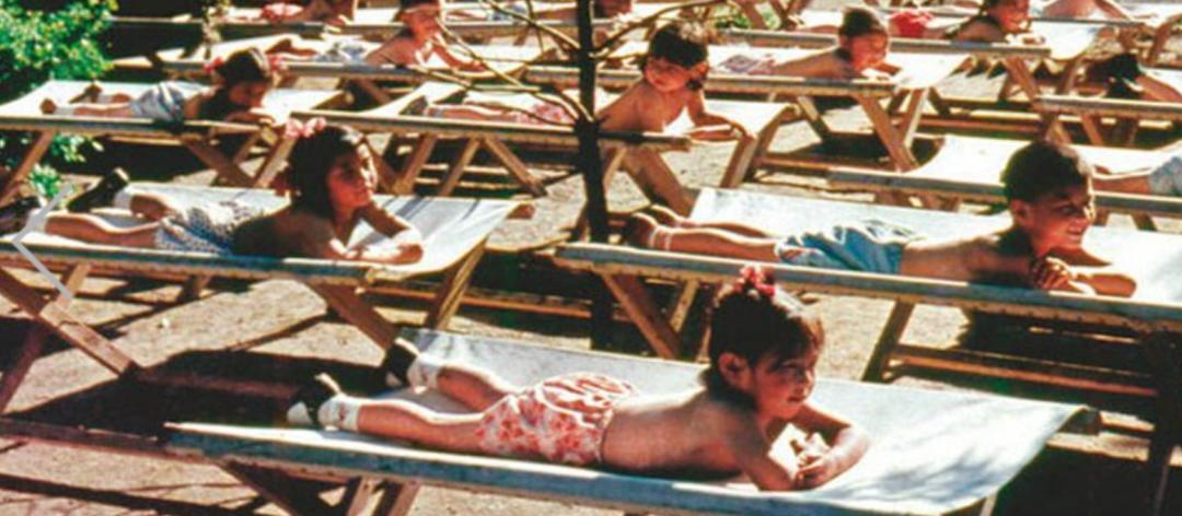 (图片为:工人村的幼儿园里,孩子们在日光浴)