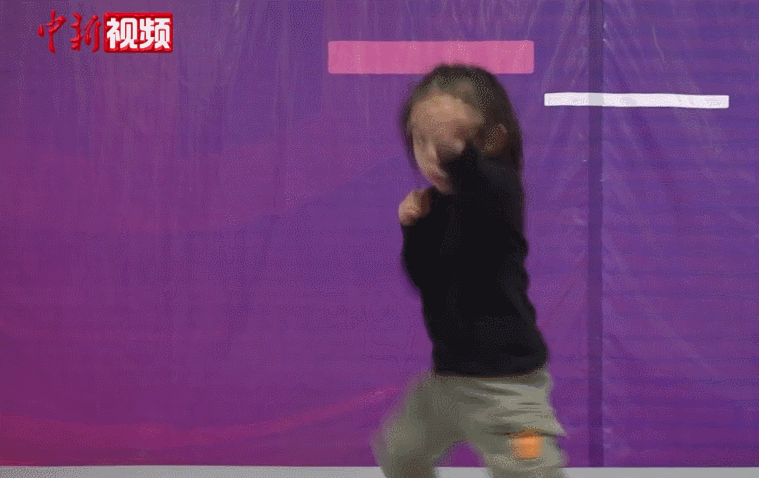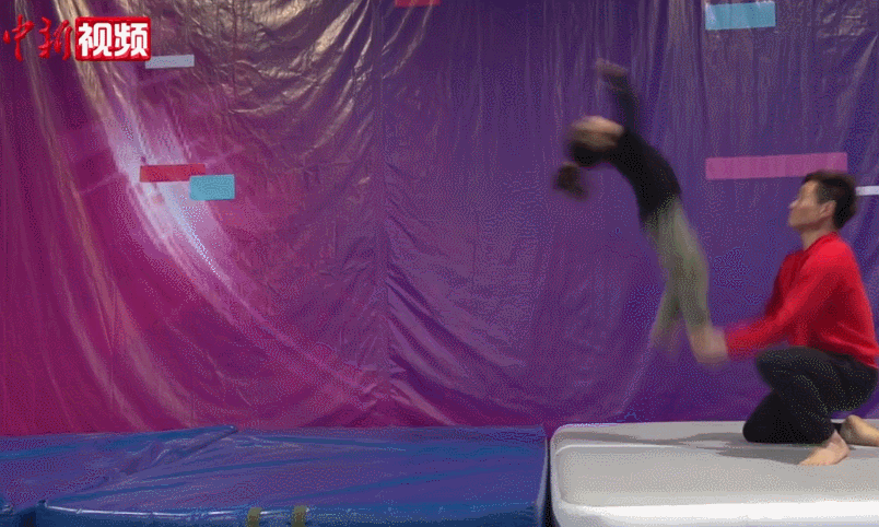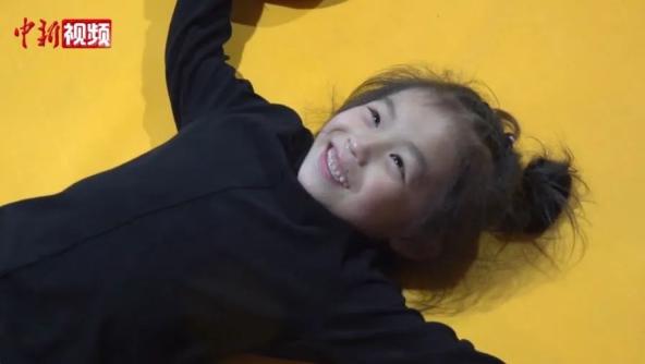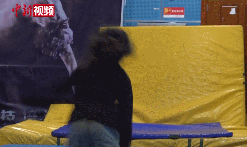 在贵州六盘水市的特技训练馆内,7岁女孩杨紫璇正在教练的指导下进行特技训练。镜头好不容易“抓住”扎堆在学员中的她,可下一秒,她一个空翻就从镜头中“消失”了。