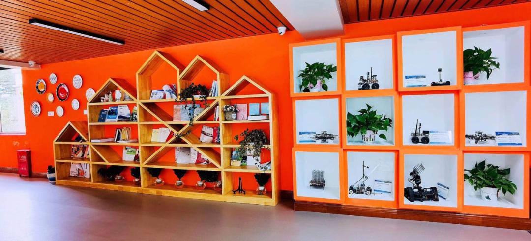 学生服务中心智慧空间一角“漂流书屋”与“竞赛展示台”