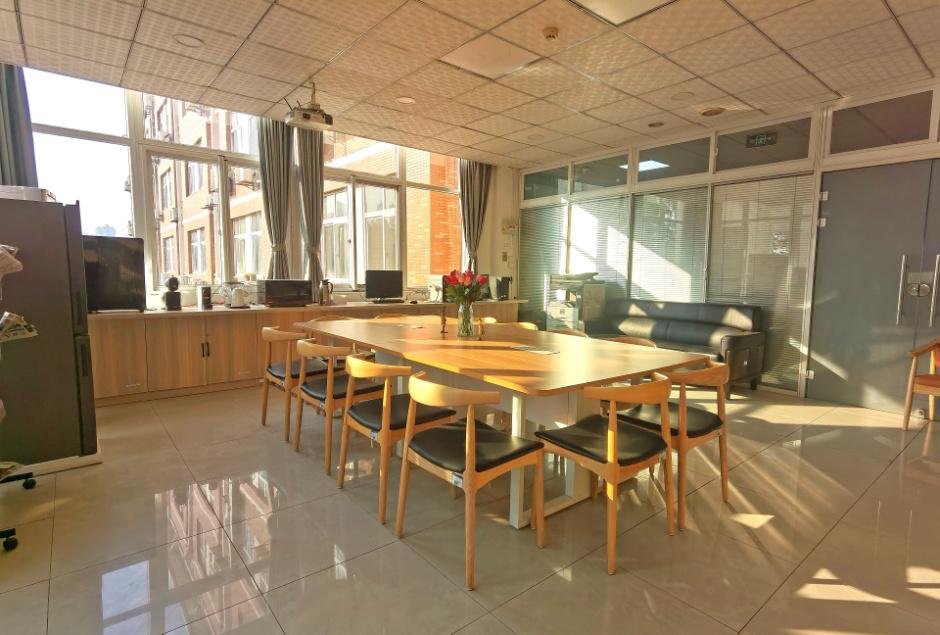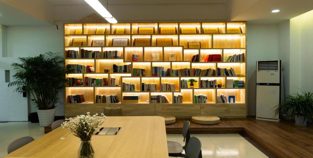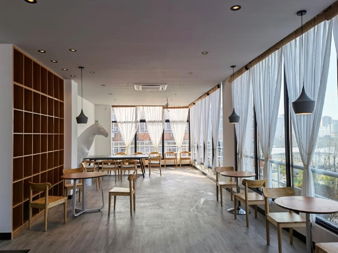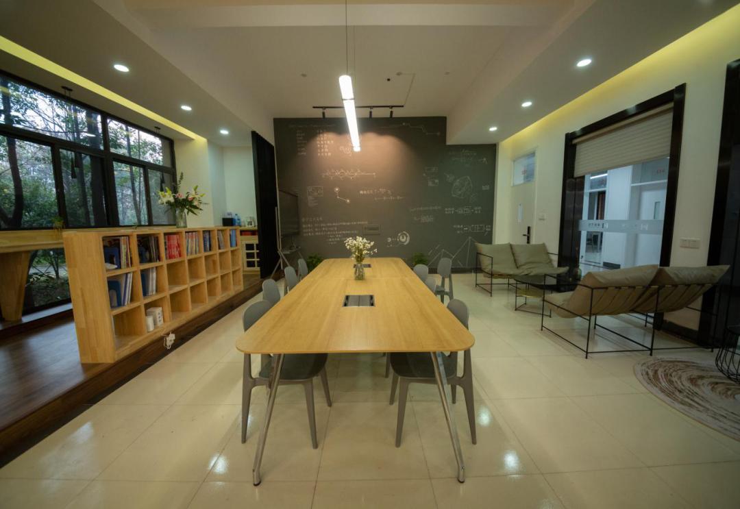 纯色的圆桌、木质的椅子,带卡座设置,还有可供多人开会的会议桌,配合着墙边的一排书架,是可供小憩、读书、开会、座谈的多功能区域。