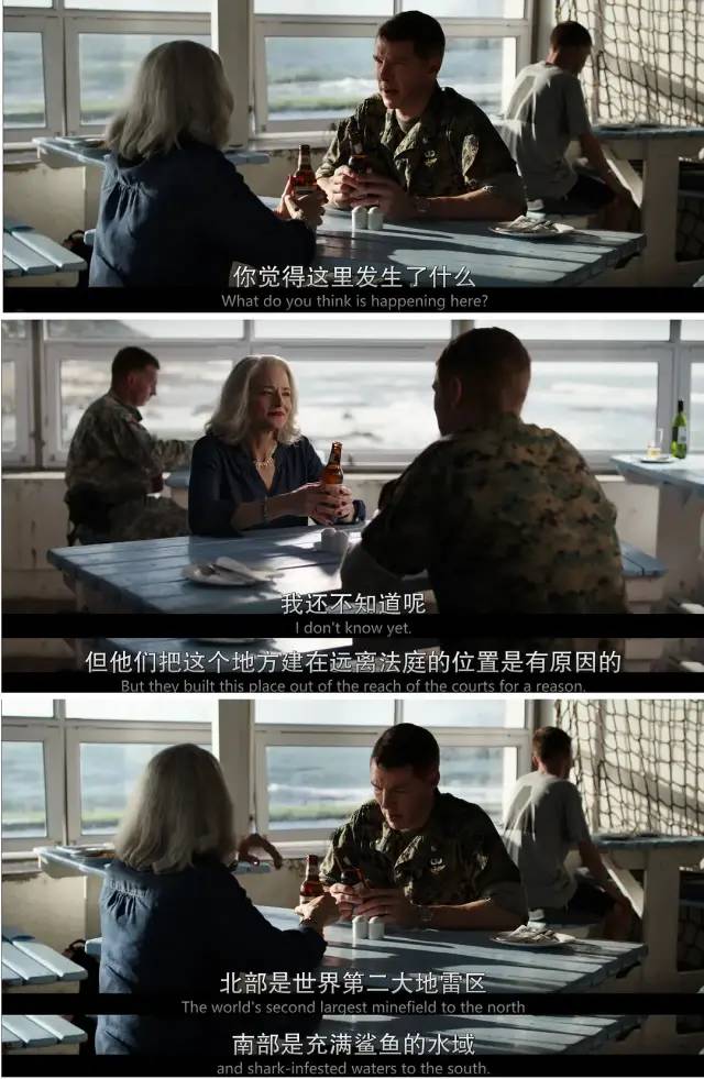 这时,斯图中校来到关塔那摩,遇到了律师南希。两个人,一个代表公权的审判,一个代表人权的诉求。