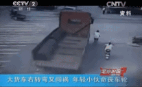 ☞ 大货车有盲区,尤其在转弯时,驾驶人看不到处在盲区内的行人、非机动车骑行者。
