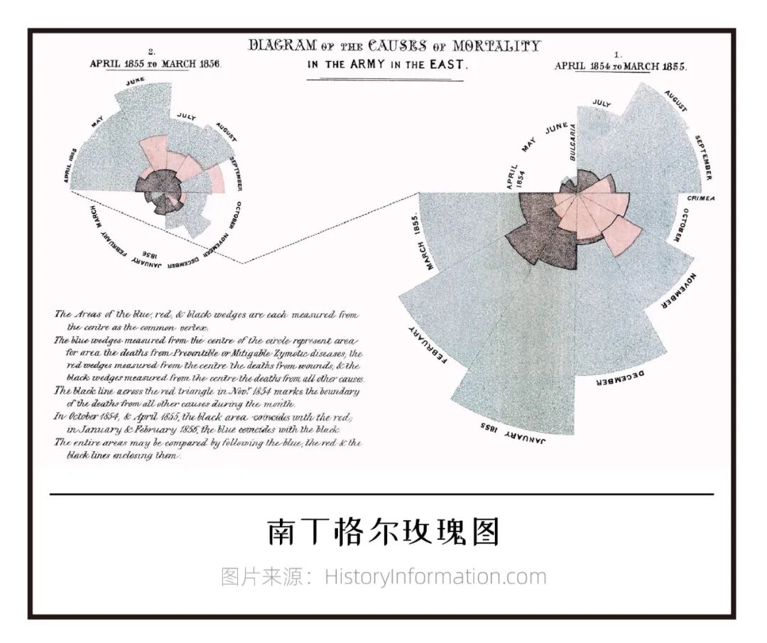南丁格尔玫瑰图,又称鸡冠图,诞生于19世纪的克里米亚战争时期,迄今仍被广泛地运用。