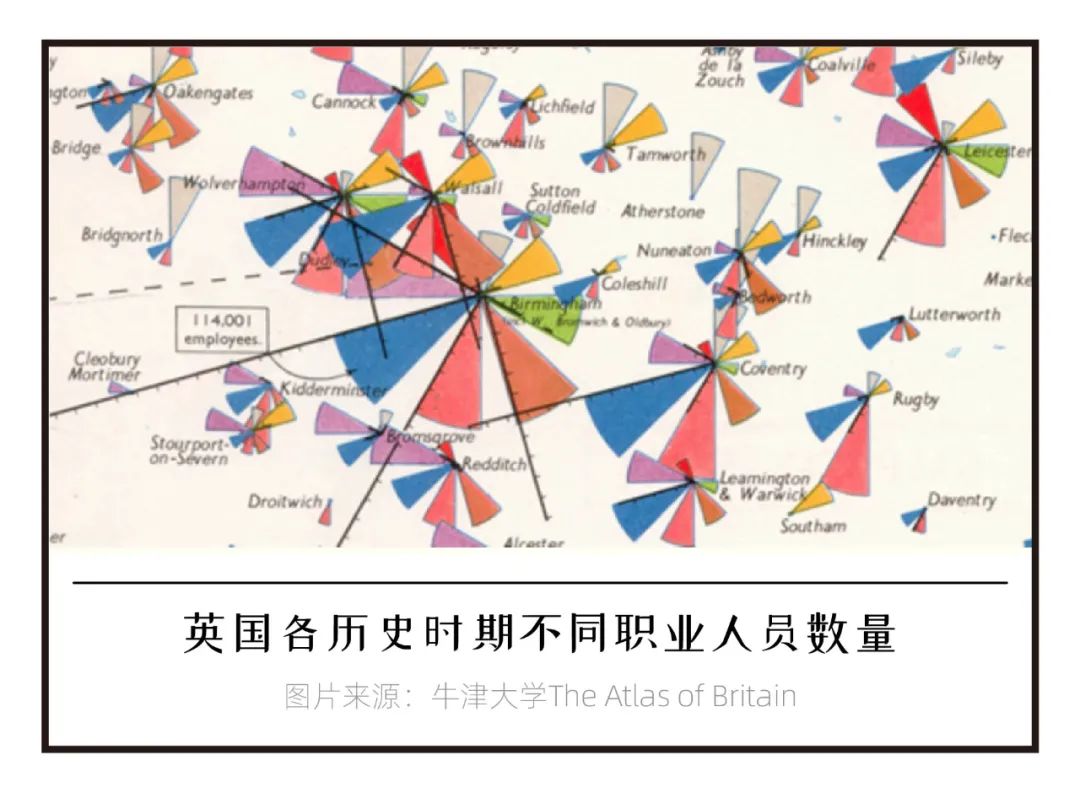 1963年牛津大学出版社发表一篇题为“The Atlas of Britain”,该图通过多个玫瑰图的使用表现出英国不同历史时期各种职业的从业人员数量。