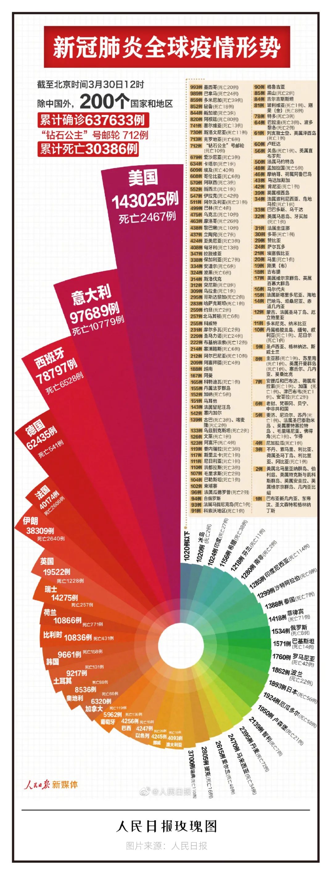 2020年3月30日人民日报用一张玫瑰图描述了全球疫情趋势图,简单明了又极具视觉冲击力。