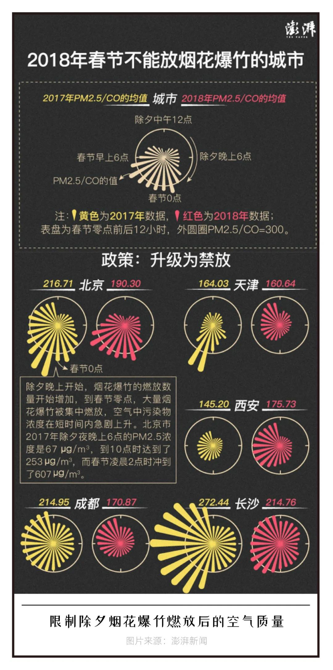 澎湃新闻利用变形的玫瑰图外形和烟花的相似性制作了《多地烟花爆竹燃放收紧后,除夕夜空气质量怎样?》,计算了PM2.5与CO(一氧化碳)的比值来评估烟花的环境影响。