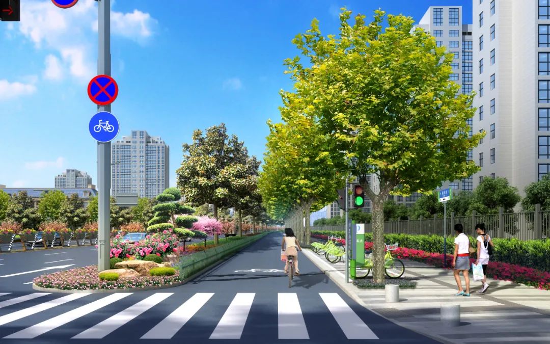 本次改造中,为提升城市环境,打造特色街区,设计中将采用环保石材质铺装人行道,铺装建筑小品和精心栽植的绿化为点缀,融入青春、文艺等时尚元素。