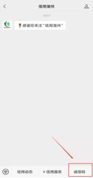 (1)关注“信用湖州”微信公众号,在下方菜单选择“诚信码”,诚信码用户登陆已接入浙江省政务服务网实名认证,已有浙江省政务服务网(浙里办)账号的湖州户籍市民可直接登陆,还未注册的可在线免费注册。