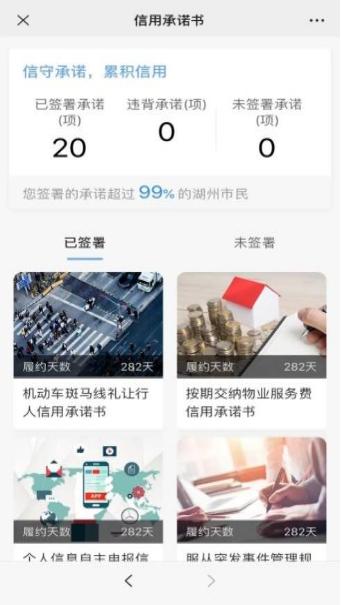 (4)点击信用承诺,可在线签署各个承诺;点击未签署,选择需要签订的承诺书在线承诺。点击履约天数可查看已签署承诺和未签署承诺数量以及所有已签署承诺的履约。
