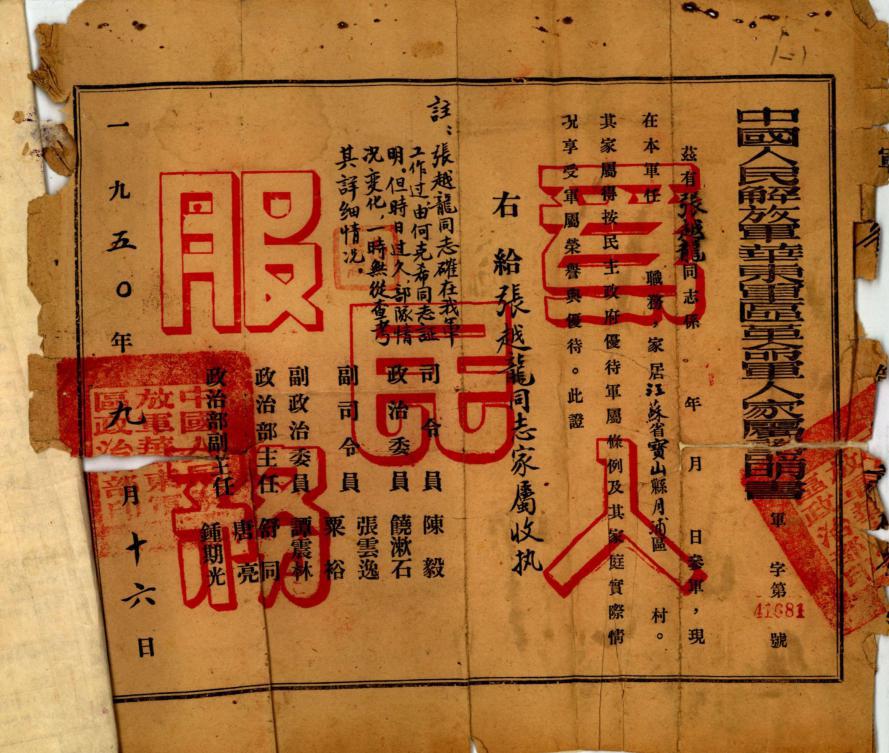 1950年9月16日陈毅司令员给张越龙烈士家属签发的《中国人民解放军华东军区革命军人家属证明书》