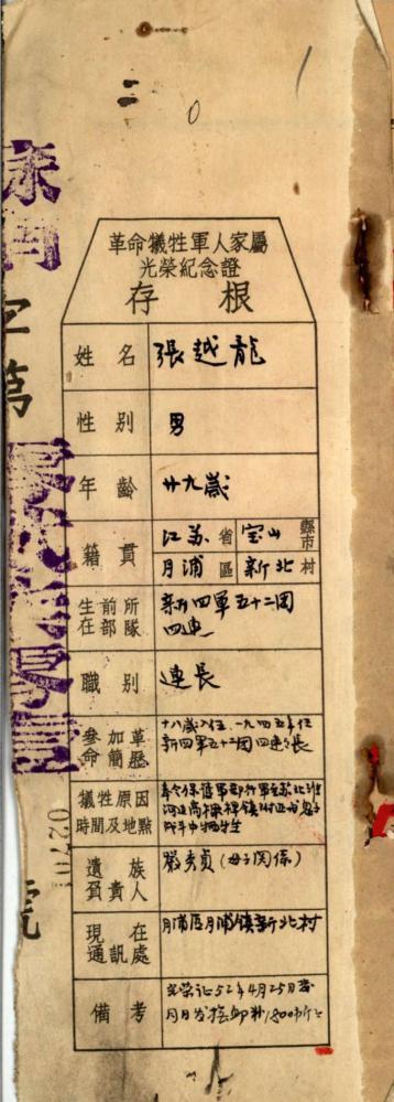 宝山区档案馆馆藏的《革命牺牲军人家属光荣证存根》1954年,顺河地方政府和群众收埋了烈士忠骨,在洪泽县西顺河镇北边,当年的战场附近建造了二十六烈士陵园。