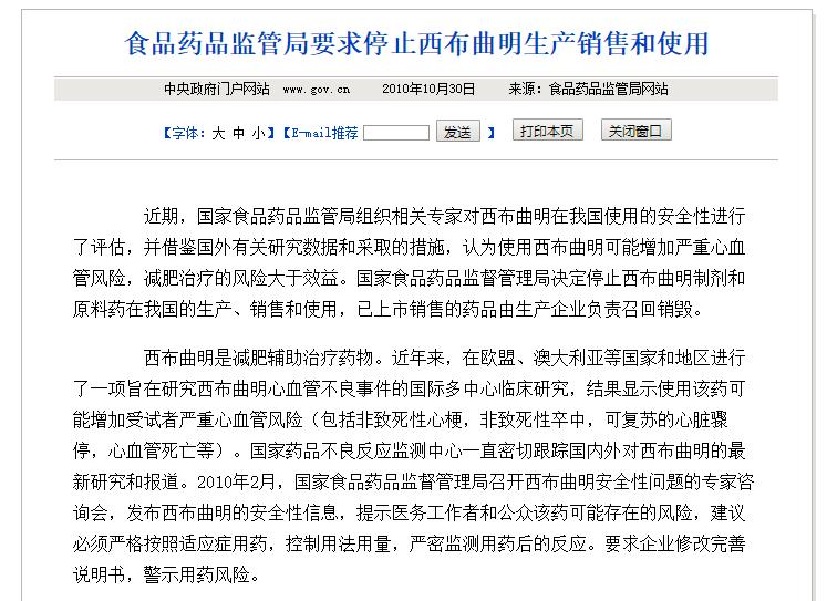 据周兆成律师介绍,西布曲明曾被用于肥胖症治疗,但因可能增加严重心血管风险,减肥治疗的风险大于效益。国家有关部门早在2010年就发布《关于停止生产销售使用西布曲明制剂及原料药》的通知。其中明确规定停止西布曲明制剂和原料药在我国的生产、销售和使用,撤销其批准证明文件,已上市销售的药品由生产企业负责召回销毁。