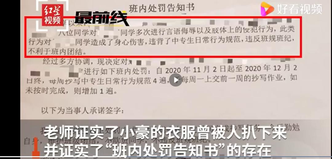 H 被诊断出重度抑郁,并出现了自残自杀行为。而校方在知道真相后,处置方式竟然是:要求施暴者每周抄写中专生日常行为规范4遍!!