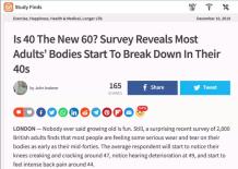 2019年10月,英国一项调查发现,多数人从40多岁就明显感觉健康在走下坡路,这项调查研究涉及2000多人,大部分受访者表示,37~40岁身体开始出现健康问题。通常,人们44岁左右感觉到背痛,46岁嗅觉变得迟钝,47岁左右膝盖出现异常、脚踝力量变弱,49岁左右听力下降并出现关节疼痛。而视力最早在20多岁就开始恶化。