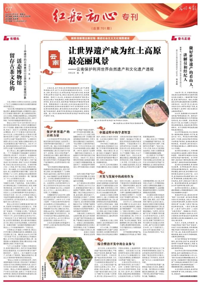 云南对世界自然和文化遗产的保护利用,如今实现了由单一主管部门保护向全社会公众共同保护的转变,形成省、州市、县(市、区)三级管理机制,加强法律法规制度建设以促进保护发展,五个世界自然和文化遗产地均出台了保护条例和管理规划,促进了生态环境和生物多样性的保护,助推了脱贫攻坚和乡村振兴,持续推动了科考研究,使世界遗产成为红土高原最亮丽的风景。