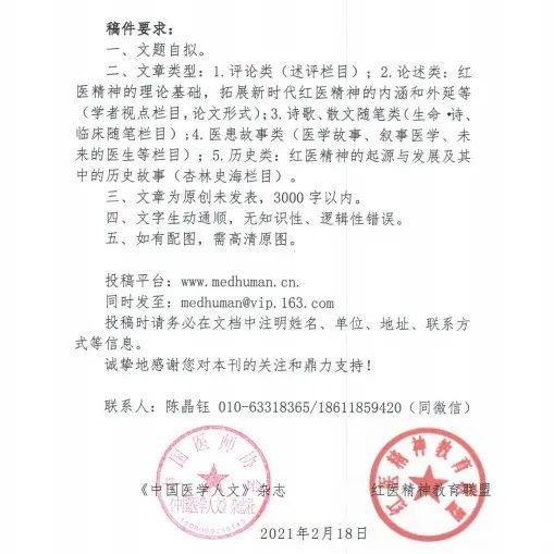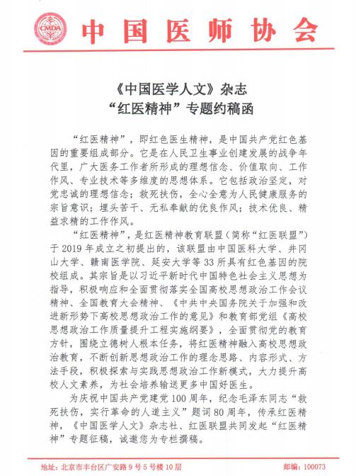 原标题:《《中国医学人文》杂志 “红医精神”专题约稿函》