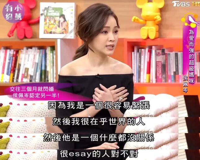 当初,交往3个月,就迅速嫁给了名不见经传的黄伯俊,表面看来是因为妈妈认定了这个女婿,侯佩岑说自己听妈妈的话,才会答应求婚。这当然是一方面。但另一方面,和黄伯俊在一起,侯佩岑的确不用刻意去讨好,反正他都会包容。