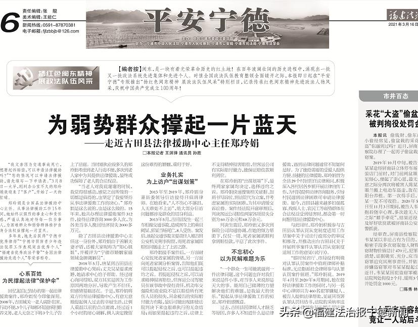 “我父亲因为交通事故死亡,想要起诉赔偿,可以申请法律援助吗?”“您的情况可以申请法律援助,请先填写一下申请表。”3月8日一大早,刚到办公室不久的郑玲娟就迎来了“客户”,开始了一天的忙碌。郑玲娟是古田县法律援助中心主任。从事法律援助工作15年间,她始终以强烈的事业心和责任感,严谨认真地对待每一位当事人,为困难群众和弱势群体维护自身合法权益撑起一片蓝天。