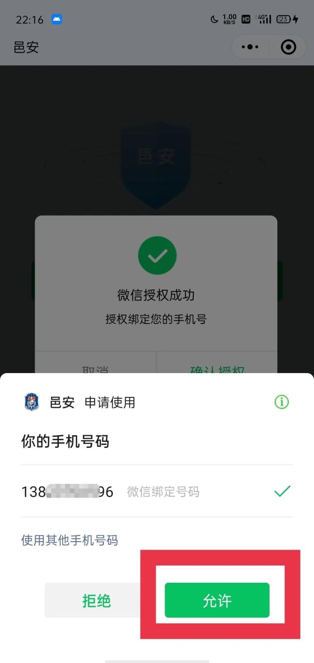 5、授权允许使用“手机号码”(首次注册“邑安”反诈小程序获取手机号的时候,有多个手机号的情况下,务必要选择我们常用的手机号进行注册,以便获得专业及时的保护。)
