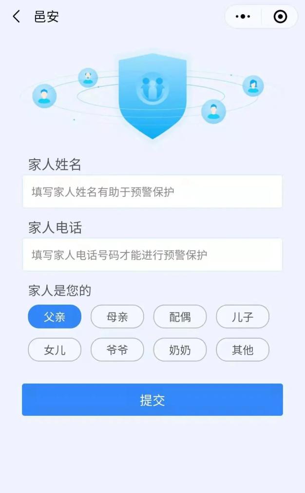 (添加家人信息,当您的家人遇到疑似网络电信诈骗时,也会有相关预警情况反馈给辖区民警,为您的家人提供及时的防护)