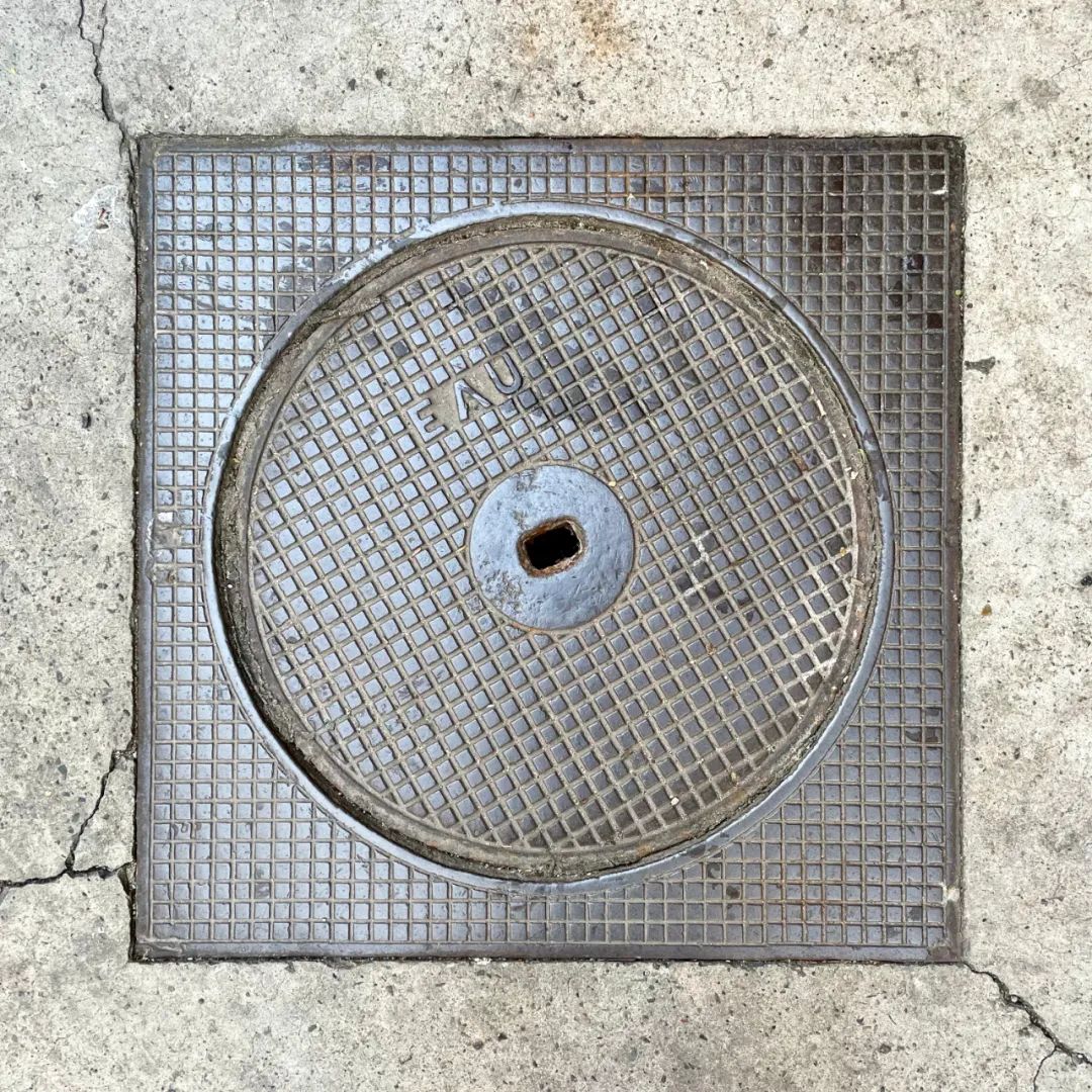 这个窨井盖上铸有法语“EAU”(水),格里董推测:“可能与租界时期法商自来水公司相关。但是也偶尔在原公共租界范围内看到过这类金属井盖。”▼