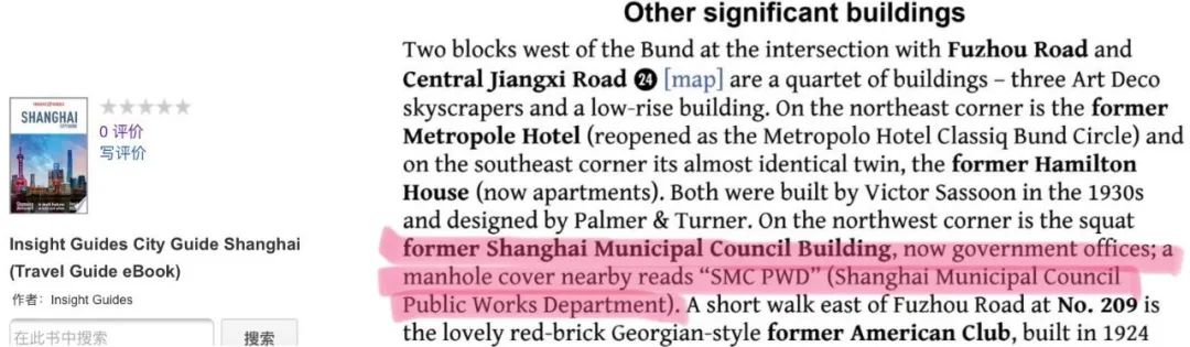 比如下面这本上海观光指南,就提到了在汉口路193号工部局大楼旧址附近,有一个窨井盖上写着“SMC”(工部局)和“PWD”(工务处)的字样。(大楼目前在整体修复,窨井盖是否还在,有待查证。)▼