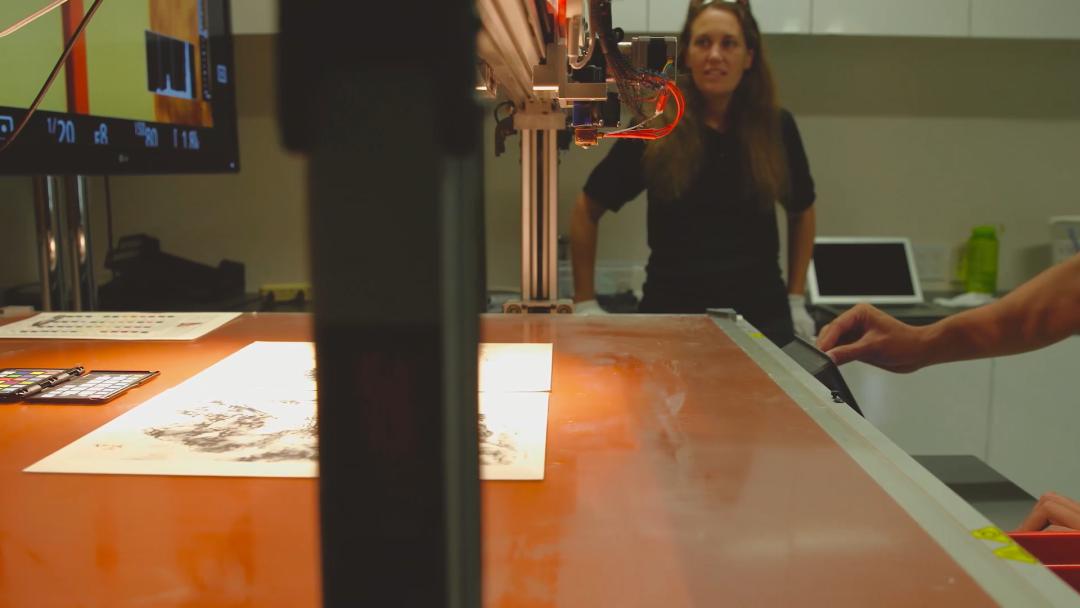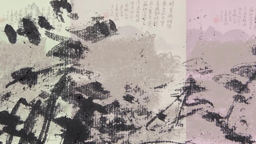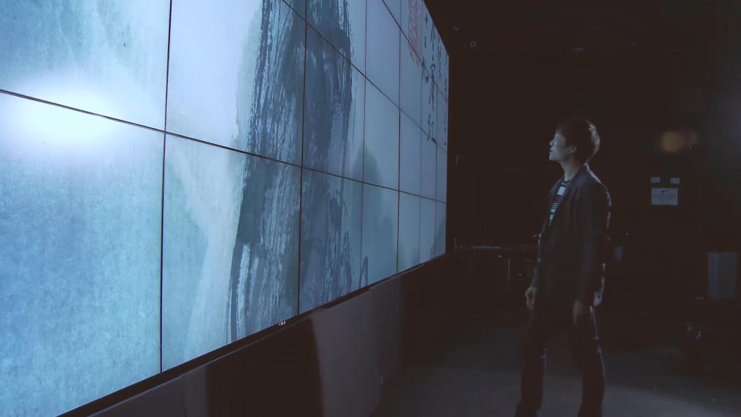 在这个项目的执行过程中,我们主要负责进行沟通协调,掌握项目的进程。这也就要求我,既需要了解艺术家对于黄宾虹画作的艺术感受,也需要把他的画作感受转化成一种科学语言,然后在我们的团队里面,让工程师进行相应的一些软件开发。现在在这个4×9的大屏幕上播放的不是作品本身,这是做这个作品过程的一个说明。整个作品大概时长是10分钟。
