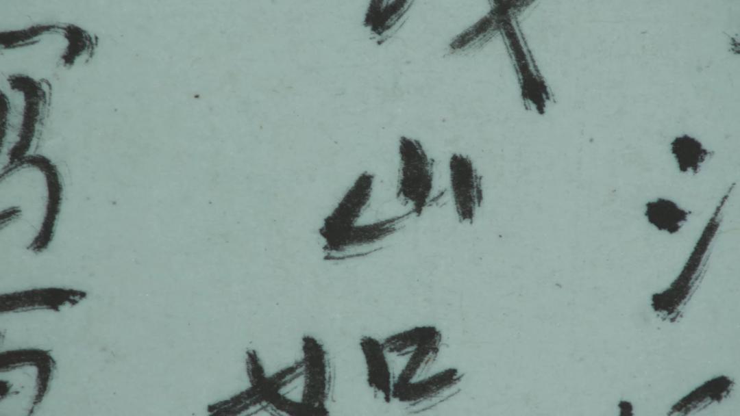 回到正题,我们通过高分辨率扫描这种方式,收集到了黄宾虹的画的很多光谱。在这个过程中,我们把画的光谱和音乐制定了一个对应关系,相当于对音高序列重新做了一个定义。我们希望通过音乐来体现黄宾虹的画作。我们现在看到的这个浮现出来的“山”字,就是把对应黄宾虹画作光谱的音乐,通过一个叫做Flitter的分拣软件,视觉化地体现出来。