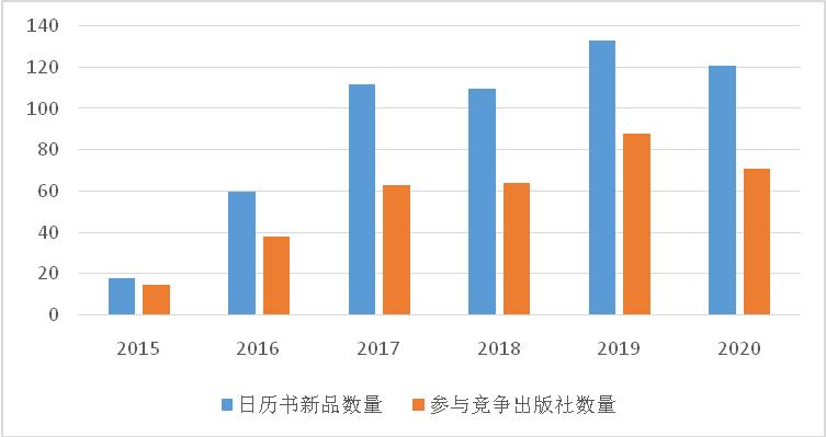 图1:2015-2020年日历书新品数量及参与竞争出版社数量变化图