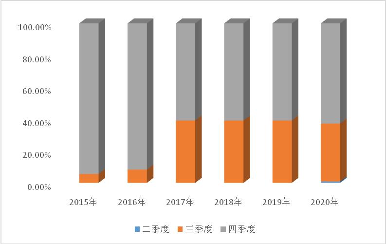 由于日历书具有较高的时效性,销售周期非常有限,随着市场竞争的不断加剧,为了尽可能延长宣传及销售周期,日历书上市时间不断前推。2015年,几乎所有的日历书都集中在第四季度上市,而来到2020年,三季度上市的日历书品种已接近全年上市品种的4成,甚至个别品种,已前推至第二季度上市。