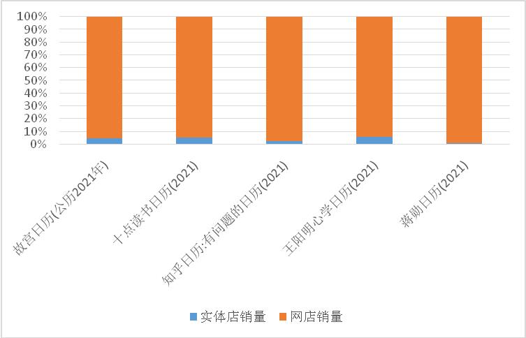 图4:2020年日历书零售市场销量TOP5在实体店、网店销量占比图