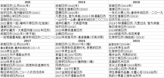 2009年故宫出版社重新出版《故宫日历》,正式拉开了文化日历书的序幕。2015年适逢故宫博物院成立90周年,随着在商业开发、品牌宣传上的开拓与创新,故宫逐渐成为年轻群体追捧的热门IP,这一年以欢悦庆升平为主题的《故宫日历2016》开卷监控销量超过24万册,超过了前面几年销量的总和,而这一年,市场上日历书的品种还不足20种。