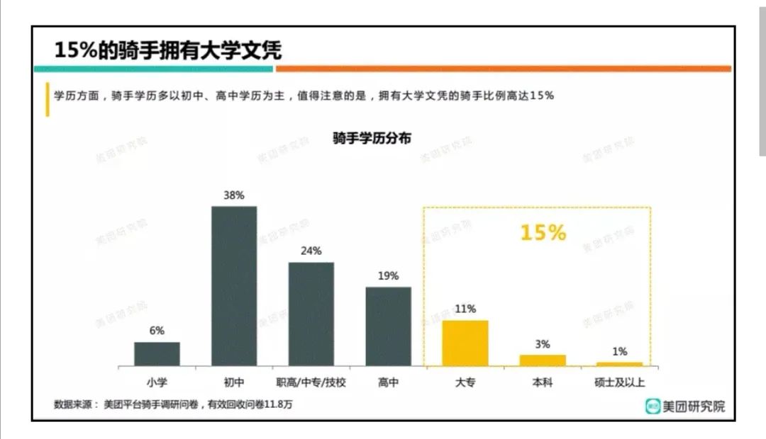美团相关负责人表示,其报告仅调查了11.8万人,从统计学的角度来看样本量太小,不能推而广之至所有美团骑手,甚至全国骑手。对此,有网友气愤地表示:“这些自媒体的流量密码就是职业歧视+宣扬读书无用论+贩卖焦虑吧!”两个并不具有代表性的“1%”,被自媒体简单渲染成“全国七万硕士在送外卖”,这种刻意贩卖焦虑,收割流量的方式实在是过于无知无畏。