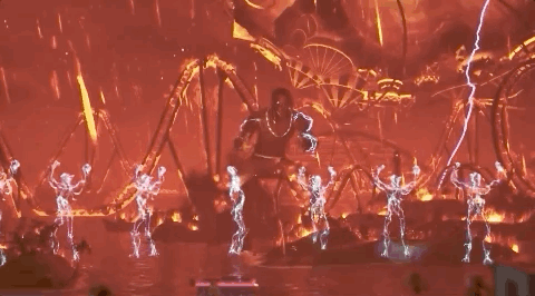 随着演唱的进行,世界发生骤变,玩家们或在星火燎原的地上奔跑,或突然沉入海底,之后又瞬间被抛入外太空。人们惊呼这是“一场超现实的、疯狂的壮丽体验”。