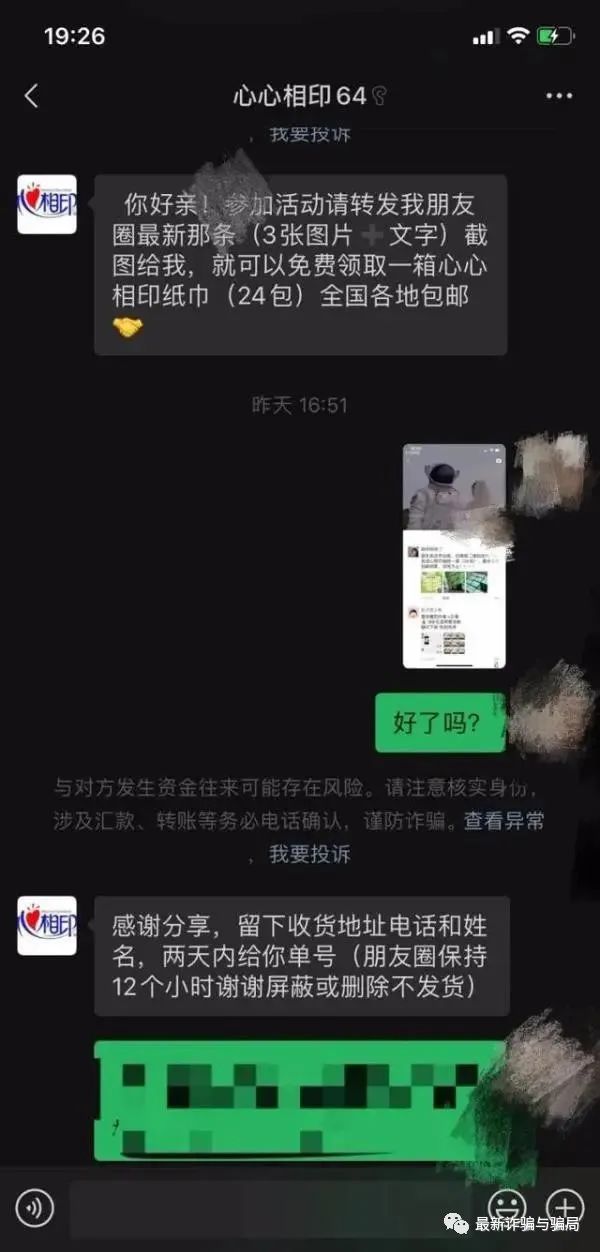于是,吕女士抱着试一试的心态,添加了对方为好友。对方的头像正是心相印的标志,但吕女士万万没想到这只是骗子的技俩。对方又称要转发其朋友圈才能领取,纸巾会以邮寄的方式寄出。吕女士就按照对方说的做了,并且告知了对方自己的姓名、手机号和收件地址。