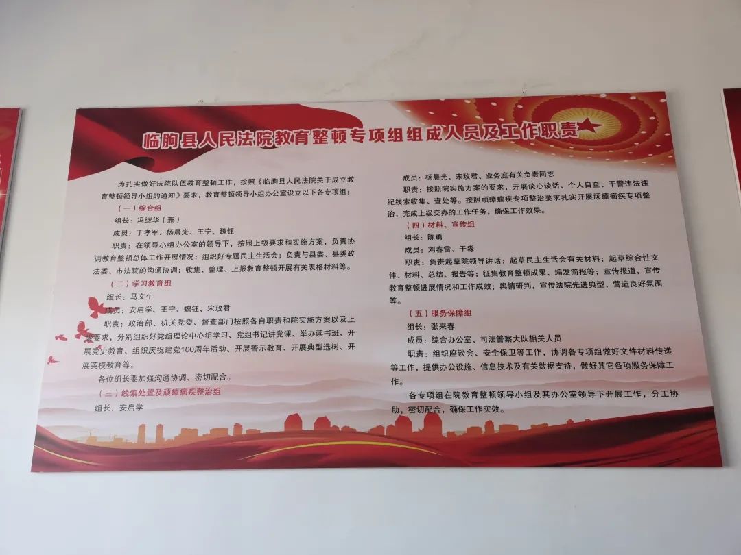 设立教育整顿办公室,将政法队伍教育整顿领导小组、职责分工、应知应会及工作流程图制作宣传挂图并上墙。