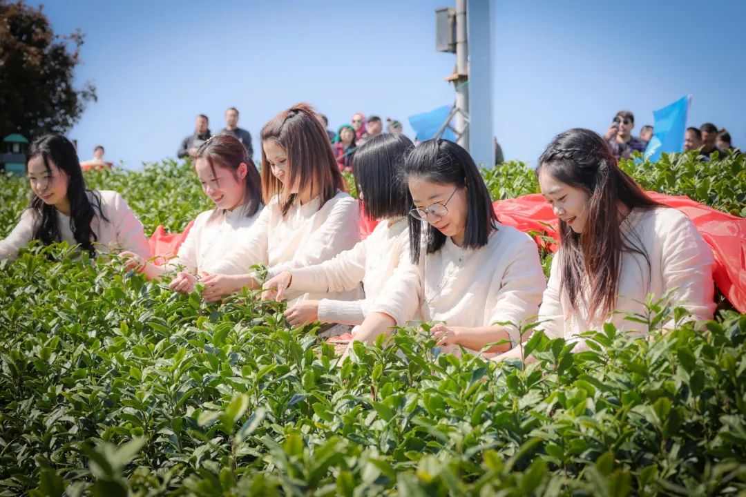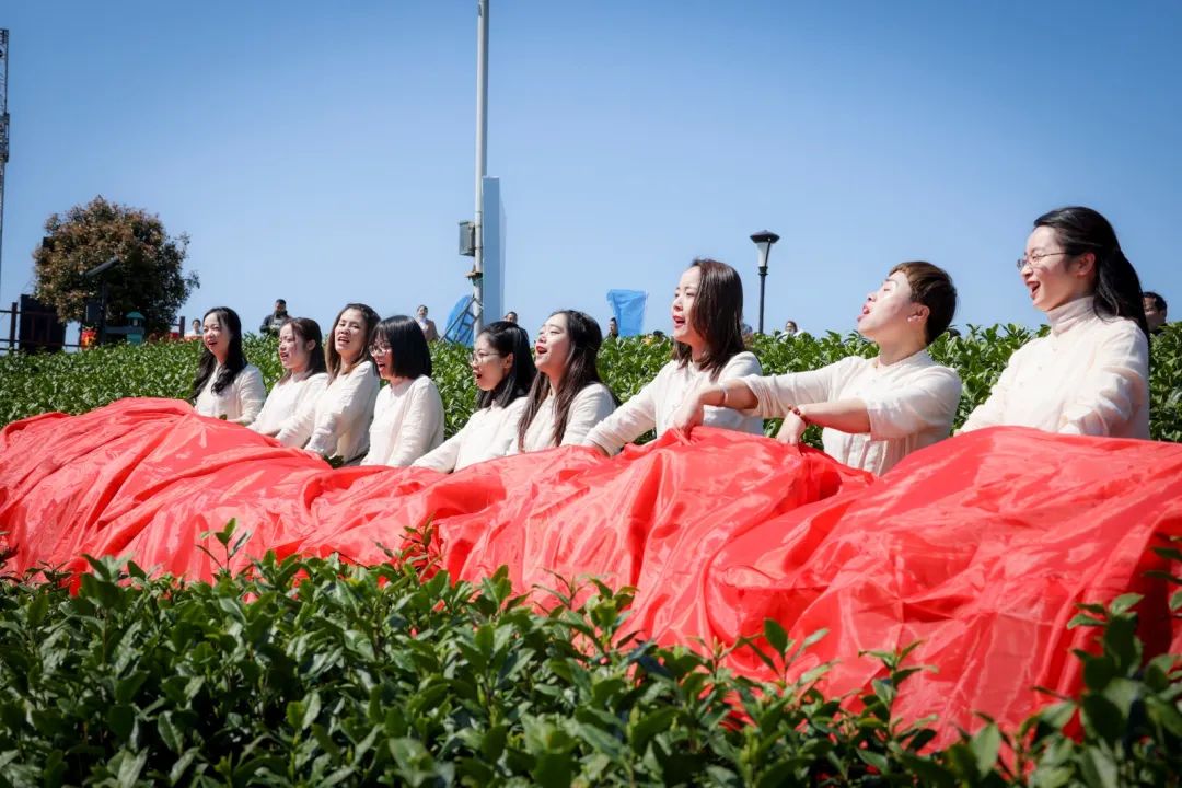 这是安吉白茶小镇开采节的压轴环节“巾帼采金叶”的场景,安吉县溪龙乡、村两级妇联主席、妇联执委共9人,今天她们化身为“白茶仙子”,在万亩茶园揭幕开采,预示着安吉白茶原产地溪龙的白茶正式开采,同时祈愿新的一年采茶季,风调雨顺,茶农大丰收。