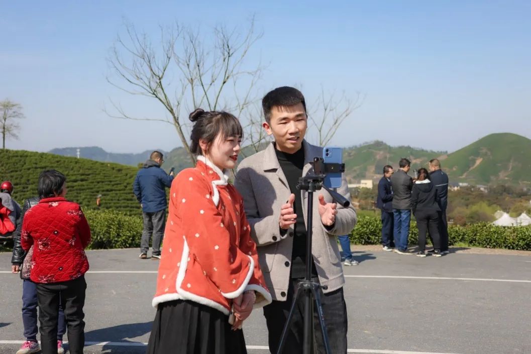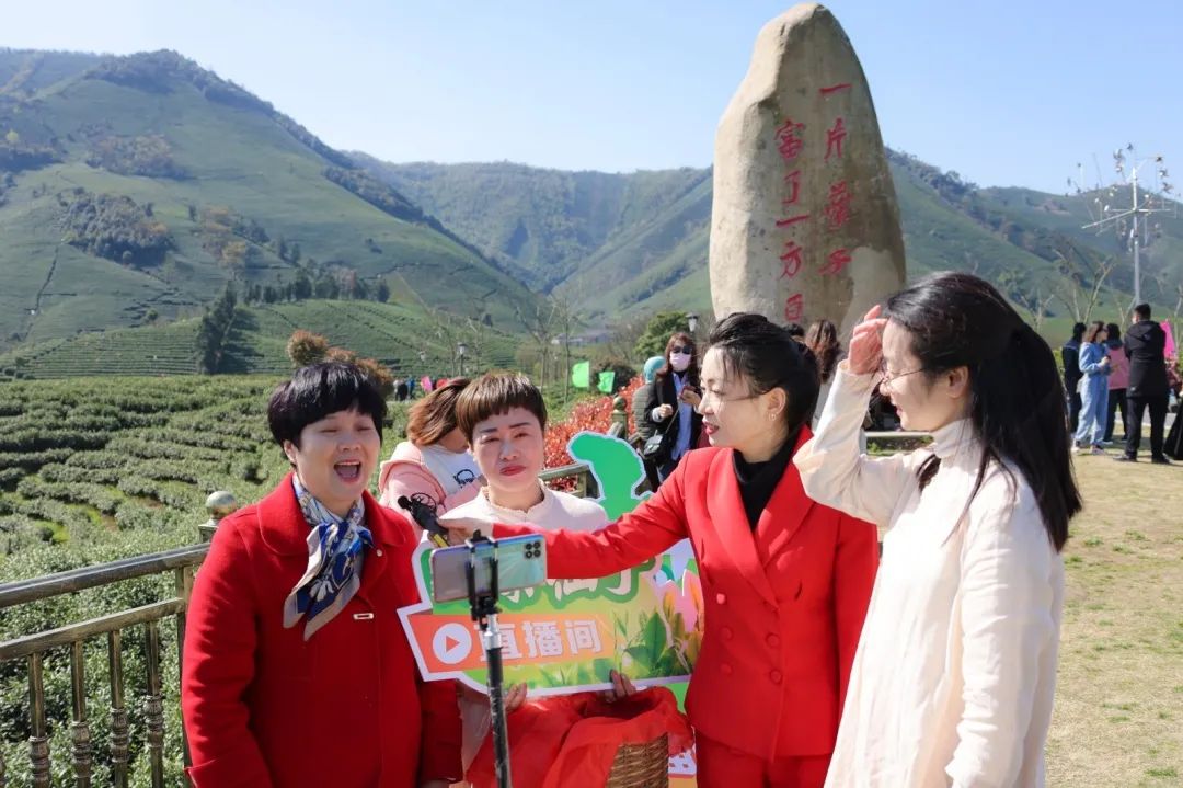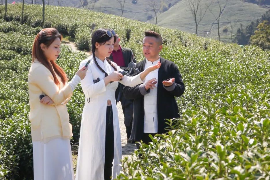 开采仪式结束后,万亩茶园成了一个大型直播现场。当地的一些茶厂主、茶农、白茶经销商们纷纷拿出手机开通直播间,9名“白茶仙子”客串茶农直播间,为安吉白茶站台,为原产地安吉白茶代言。现场好不热闹,让我们来看看直播盛况吧!