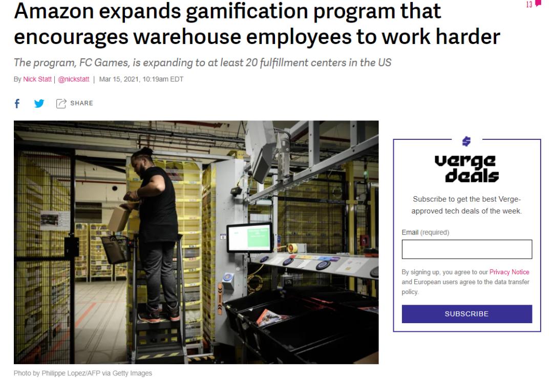 于是亚马逊的高层瞬间产生了兴趣,开始疯狂尝试在其他仓库提倡这种游戏化办公的策略,让繁琐的工作转变为具有挑战的游戏,从而减轻员工们的压力。