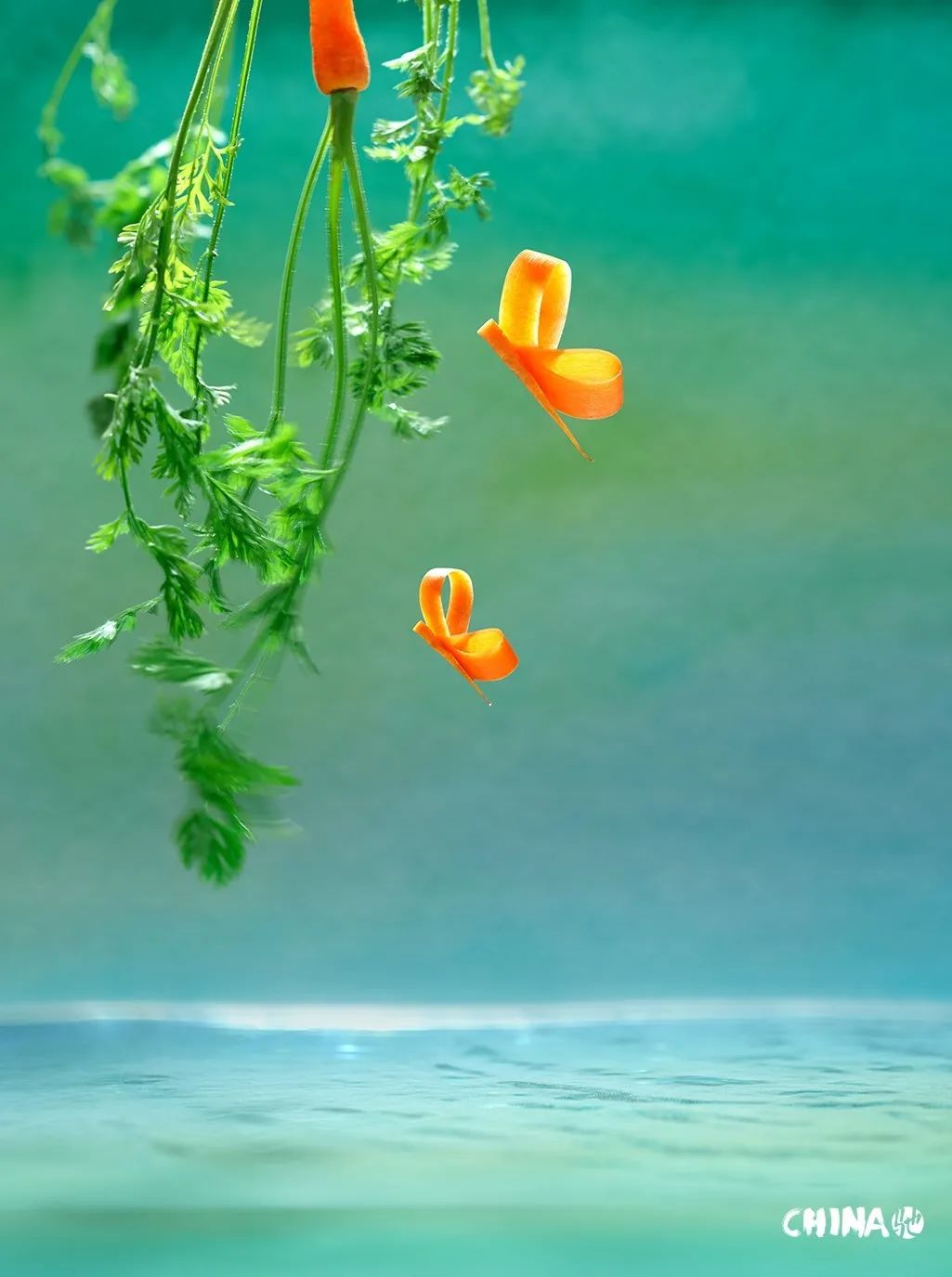 不过他展示二十四节气的方法有些特别:立春到来,蝴蝶在水面之上的垂柳边玩耍,仔细看,蝴蝶和树竟然是胡萝卜做成的?