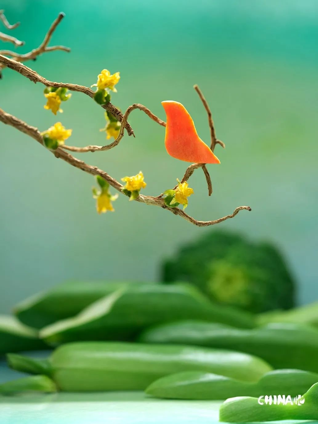 (野党参用来做树枝,树枝上的花是将黄瓜花用牙签固定在树枝上。小鸟为胡萝卜,下面的远山为西葫芦,最远处虚化的高山为青菜。)