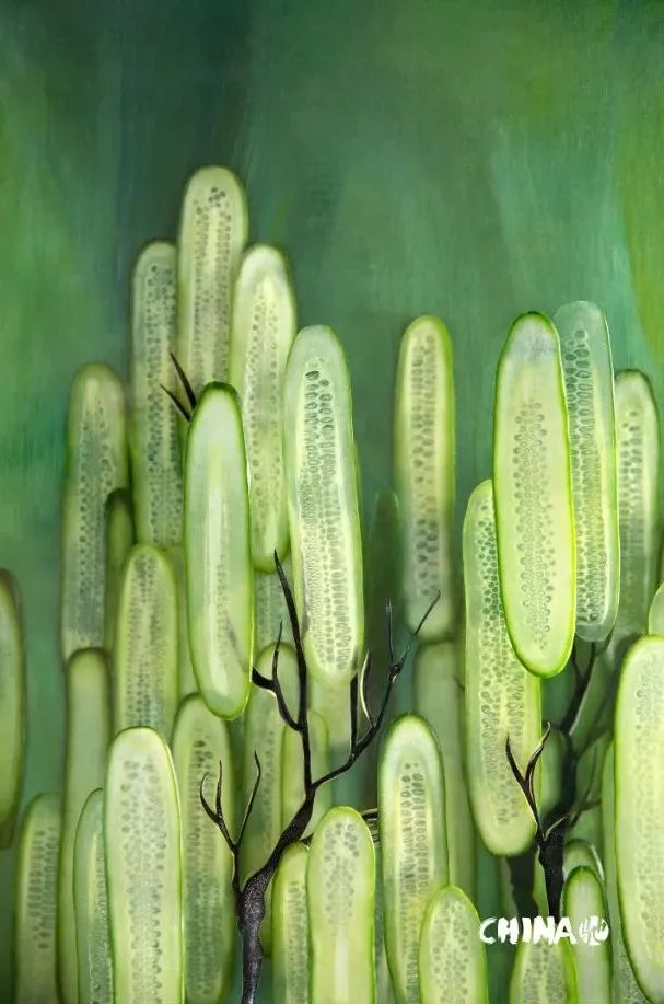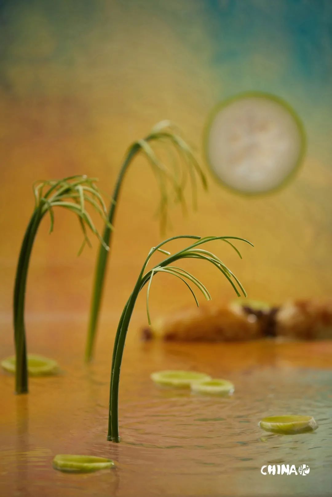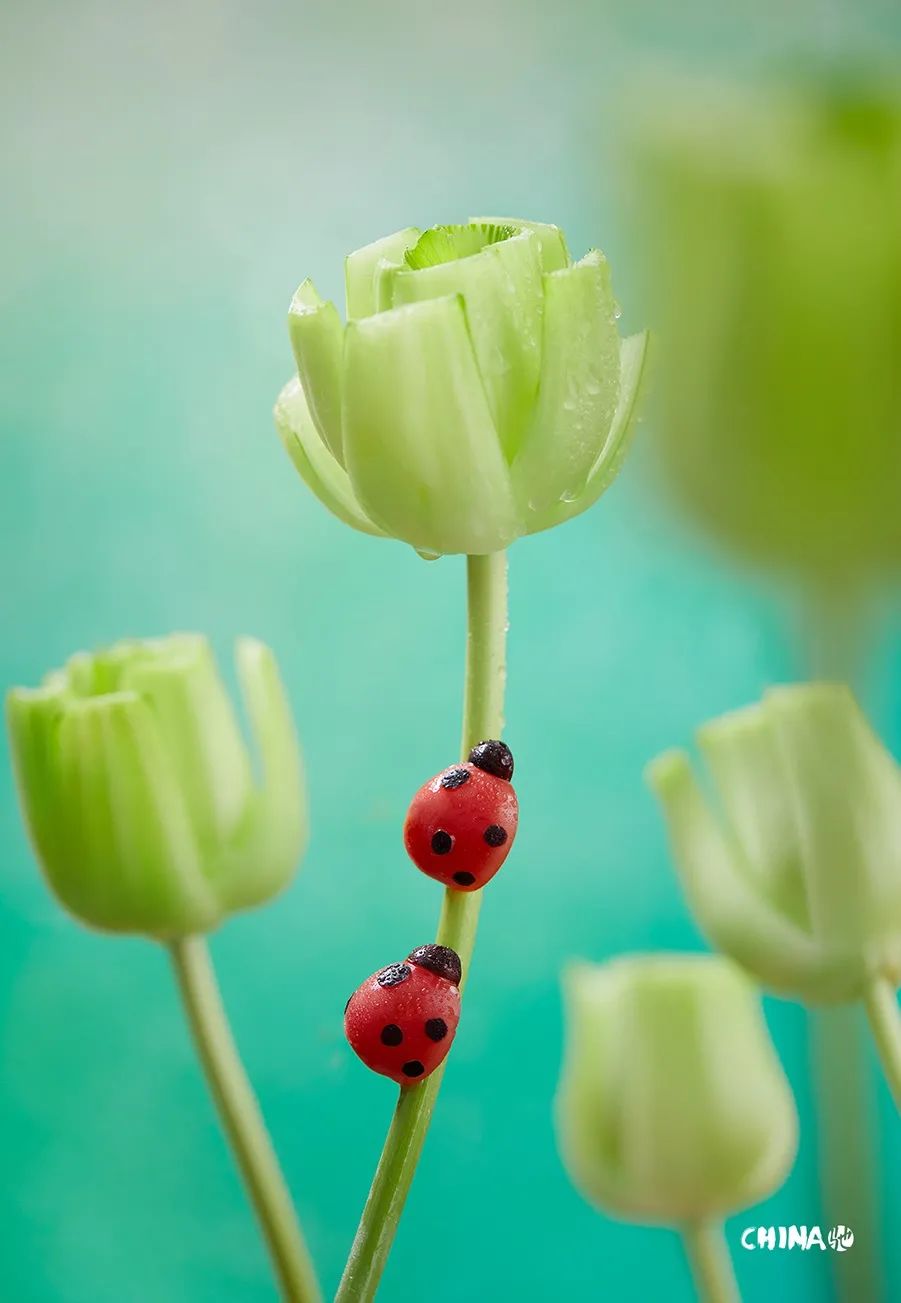 悠悠春日长,在阳光的沐浴下,在远山的映衬下,来一杯飘香四溢的茶再惬意不过了。再仔细看,这茶杯是黄瓜做的,茶叶是黄瓜花,远山和树木竟然是茴香和白萝卜,就连太阳都是萝卜切片做成的...