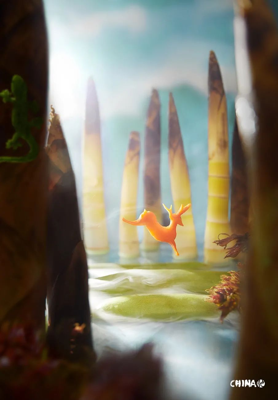 (香椿苗切掉根部前后摆放做前景,春笋做森林,趴在春笋上的壁虎用丝瓜雕刻而成,陆地是西葫芦切片制作,飞跃的小鹿为胡萝卜。)