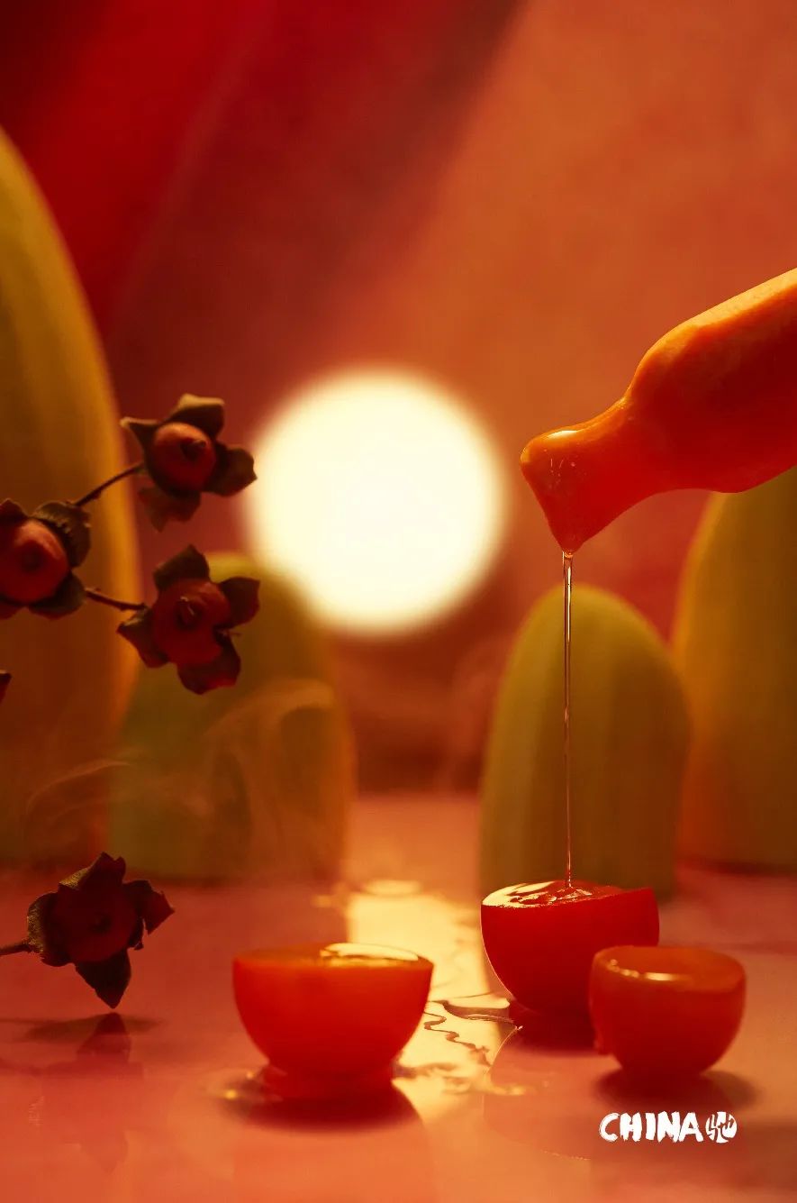 最后将食物整合,进行拍摄,拍摄的成片还会有专人配以相对应的诗词增加意境美: